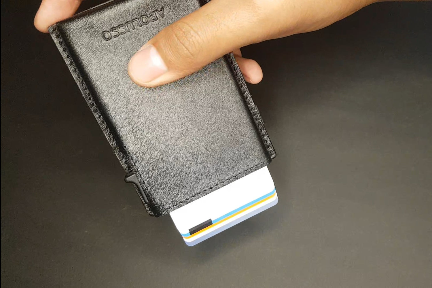 A menos que se presione el botón para expulsar las tarjetas, no se caerán incluso si la billetera se agita o se voltea.