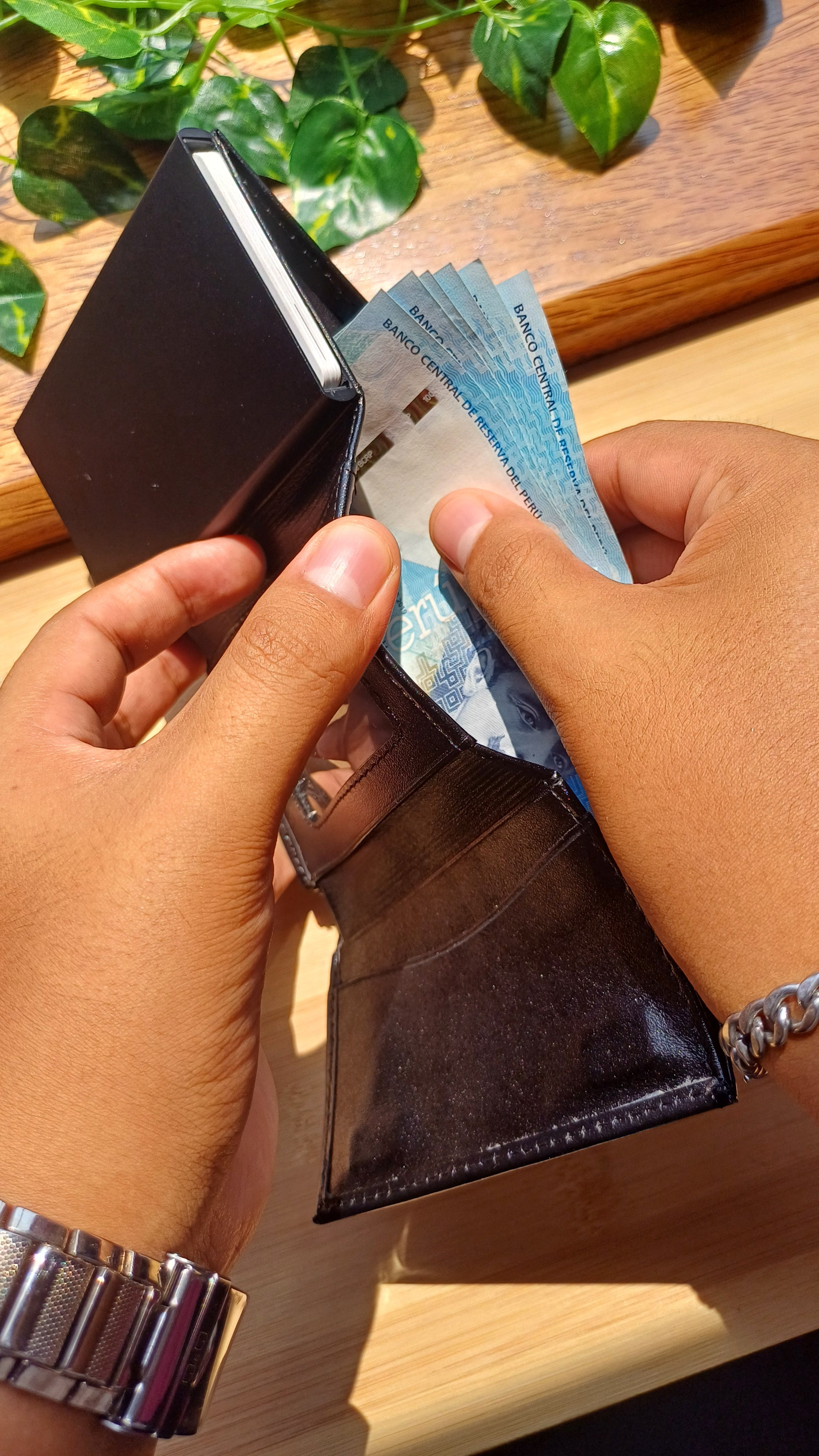 🔹 Billetera Mágica: Incluye un tarjetero con botón para hasta 6 tarjetas y dos compartimientos adicionales en el interior para más tarjetas. Su capacidad para billetes es el mismo, permitiendo almacenar hasta 15 billetes.